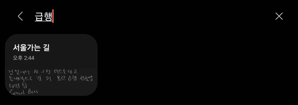 두개의 노트에서 “급행”이라는 단어를 검색한 화면이다. 두 노트 중 “서울가는 길”에만 “급행”이라는 단어가 S Pen으로 작성되어 있다.