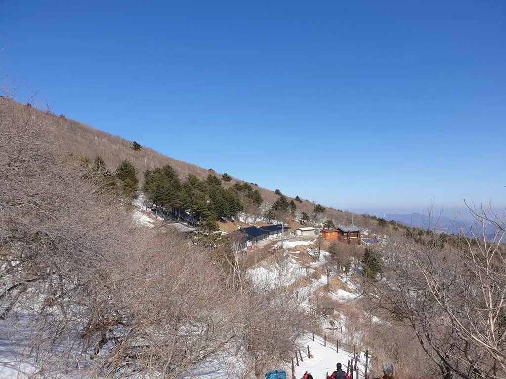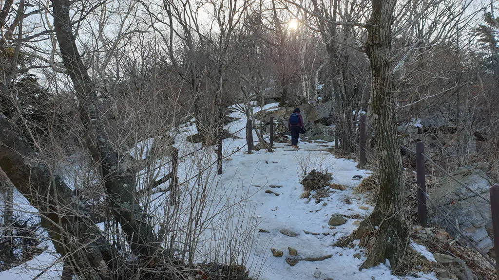 내려가는 내내 눈길이었는데… 만약 백단사 매표소(주차장)에서 올라간다면 정상까지 쉼없는 급경사길이 이어진다. 유일사에서 올라가는 편이 훨씬 수월할 듯 싶다.