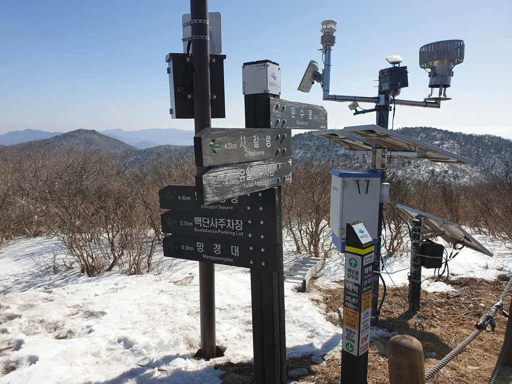 가운데 있는 화면이 달린 안내판에서 태백산 정상의 천제단을 실시간 영상으로 비추고 있다. 사진엔 나와있지 않지만 오른쪽과 뒷쪽이 주차장이다.