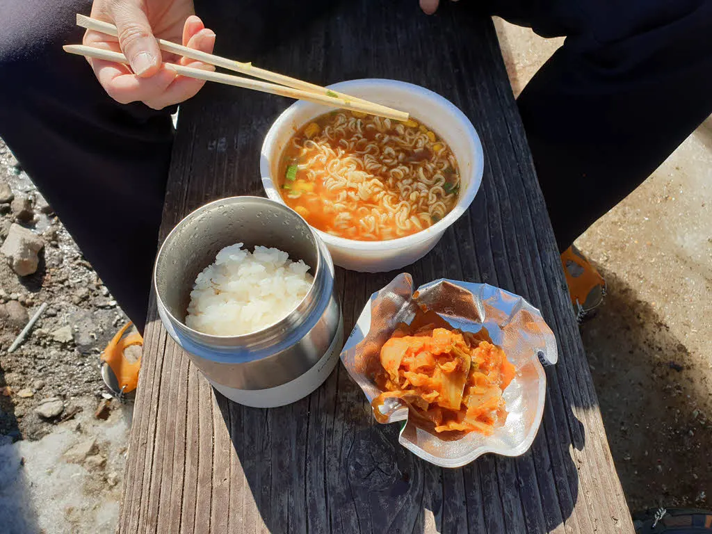 산을 오르고 하산길 초입에 먹는 간식으로 이보다 더 좋은 것은 없다. 밥과 볶음김치는 집에서부터 준비해갔다.