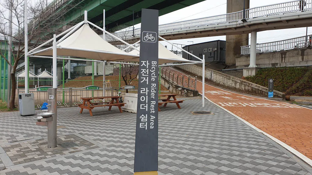 안양천변길은 한강둔치길과 연결되어 있어 자전거를 타기에도 좋다. 안양시계를 벗어나 서울로 들어서면 둔치에 농구장, 풋살경기장 등 운동시설들이 많이 보이기 시작한다. 그리고 자전거 라이더 쉼터도 보인다.