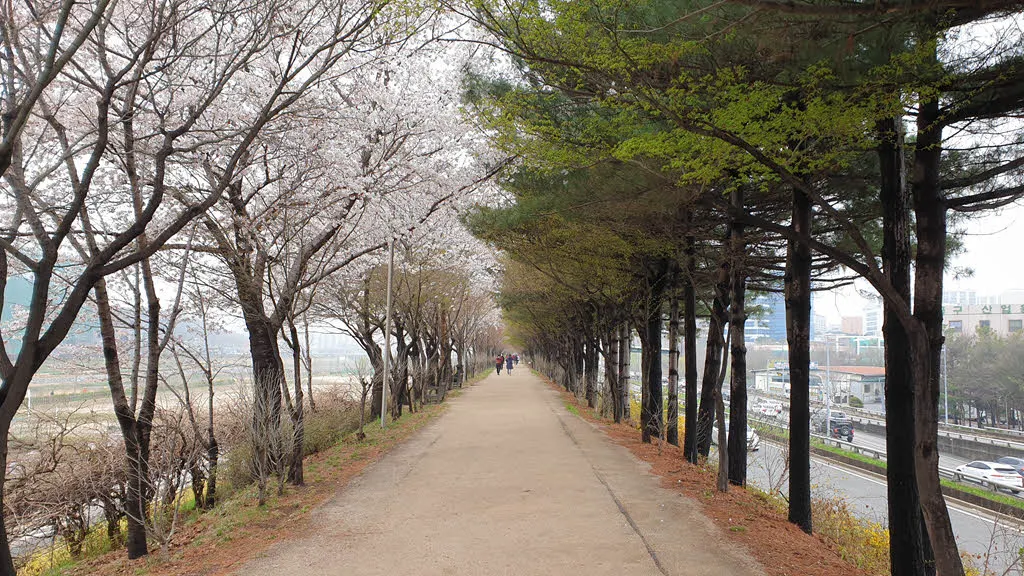 이곳부터 계속 벚꽃이 활짝 핀 길을 걷게 된다.