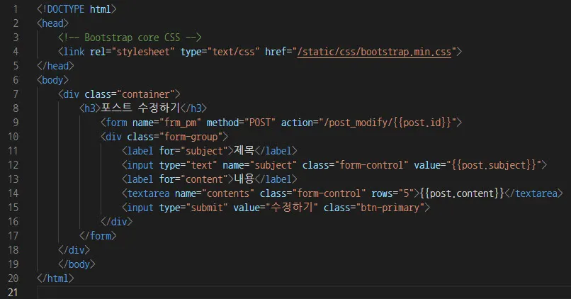 이제 렌더링할 템플릿 HTML 파일인 post_modify.html 을 다음과 같이 작성한다.