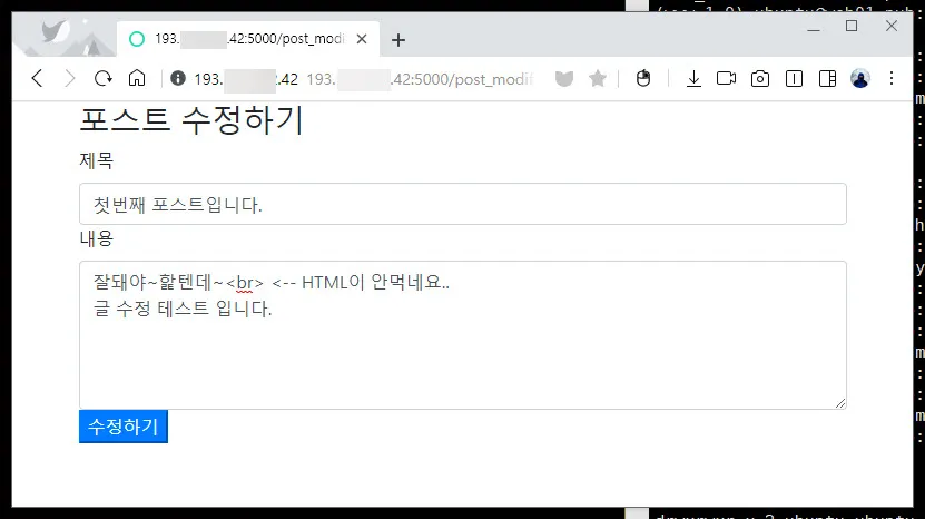 지금은 “내용” 부분을 <textarea>~</textarea>로 만들었기 때문에 줄바꿈이나 이미지 첨부가 되지 않는다. 그래서 에디터 적용을 먼저할지 자기가 작성한 글을 아무나 수정하지 못하도록 로그인 기능과 글 수정 시 남의 글을 수정하지 못하게 하는 기능을 먼저 적용할지 생각 좀 해봐야겠다.