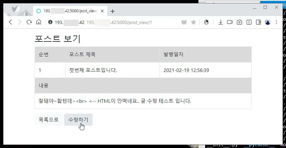 다음은 DB에서 조회한 글을 post_modify.html 이라는 웹페이지에 표시해주고 내용을 수정한 뒤 저장 버튼이 눌릴 경우 다시 POST 메소드로 전달받아 저장하는 기능을 수행하는 코드를 main_page.py에 추가해 준다.
