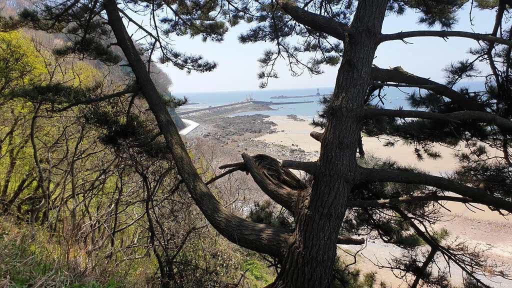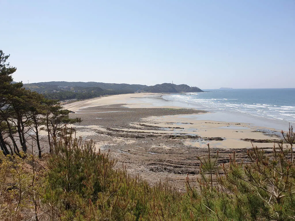 삼봉해변으로 넘어가는 즈음에 있는 전망대에서 바라본 백사장 해변방면… 멀리 백사장항의 꽃게를 닮은 다리가 보인다.