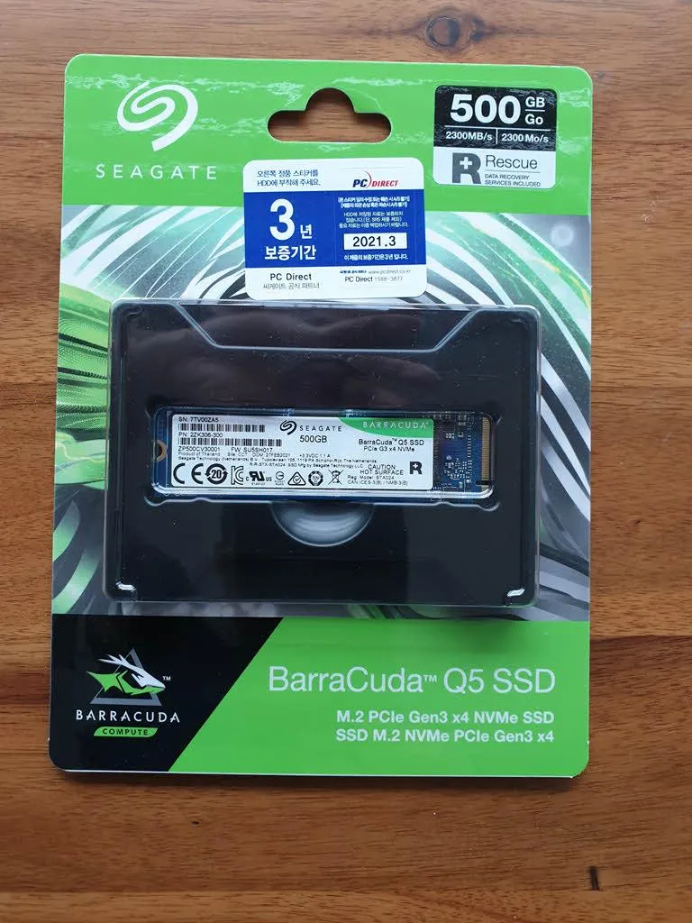 내가 선택한 SSD는 시게이트의 Barracuda Q5 M.2 NVMe (500GB) 다. 이 SSD는 3D QLC방식이고 M.2 2280규격의 폼팩터에 인터페이스는 NVMe 1.3 (PCIe Gen3 x4)을 지원한다. 그리고 내구성이 보장되는 총 쓰기 가능 용량은 119 TB이고 1,800,000 시간의 평균 무고장시간을 보장한다. 그리고 3년의 제한된 무상보증 서비스를 제공한다.