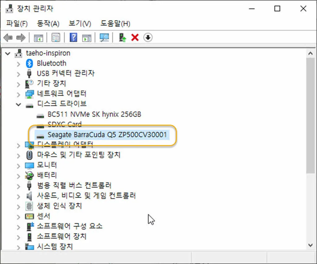 노트북을 켜고 장치관리자에서 확인하면 추가로 장착한 Seagate Barracuda Q5 M.2 NVMe (500GB)가 정상적으로 인식되고 있음을 알 수 있다.