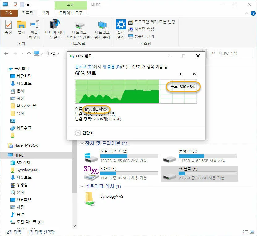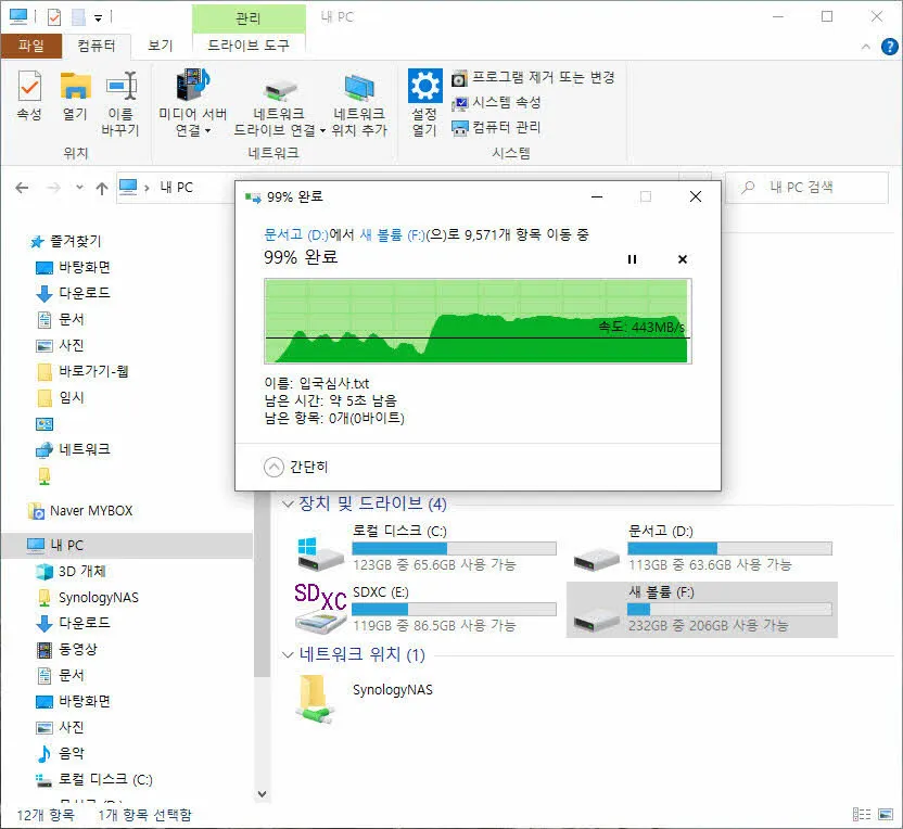 복사 테스트를 실행했다. 기본장착되어 있던 SSD에서 새로 장착한 바라쿠다 Q5 SSD로 약 100G에 달하는 파일을 이동시켜봤다.