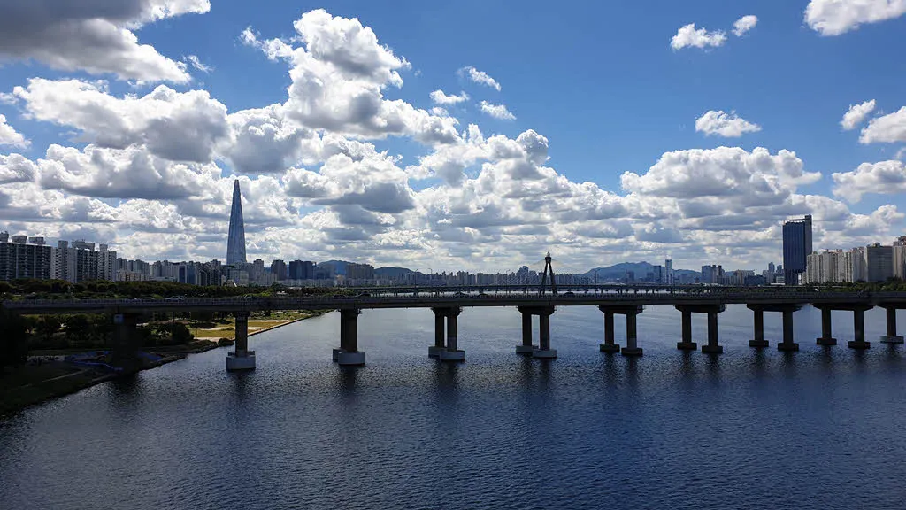 한강 하류 쪽 이다. L사의 타워도 보이고 천호대교와 헬기사고가 있던 올림픽대교의 상징물도 보인다.