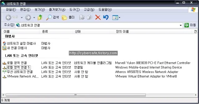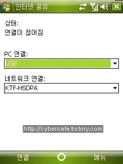 인터넷 공유 창이 실행되면 아랫쪽의 “연결” 을 누른다. 그러면 윈도 윗쪽의 안테나에 H 표시가 나타나면서 인터넷에 연결된다. 그 순간 아래 화면과 같이 “Windows Mobile based Internet Sharing Device”라는 네트워크 이더넷이 생성되면서 컴퓨터가 인터넷에 자동으로 연결된다.