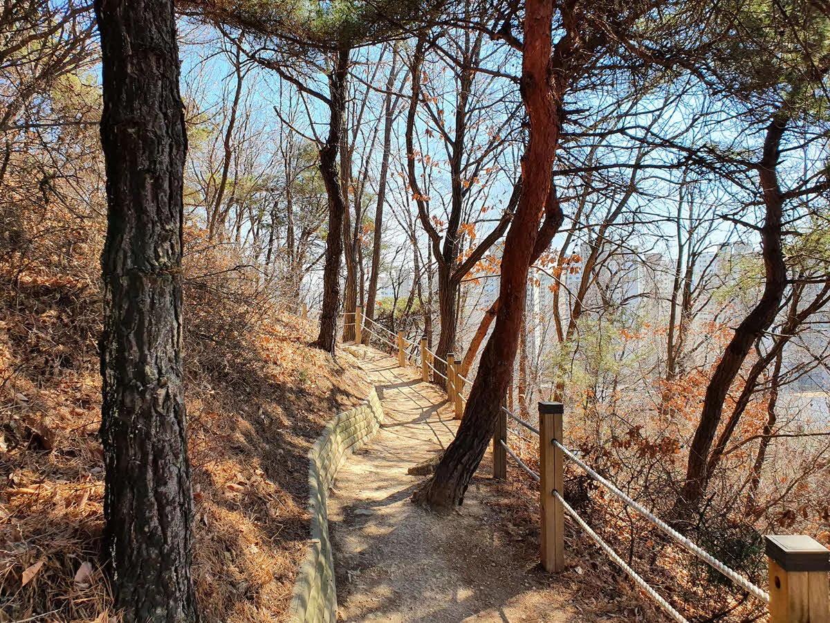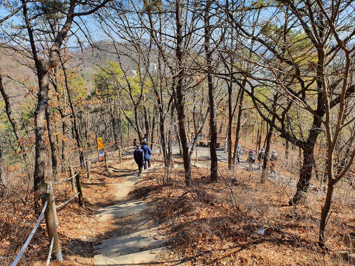 우리는 공원을 오른쪽에 두고 왼쪽으로 산을 조금 올라간다. 그러면 다시 만수산 무장애길이 나타난다.
