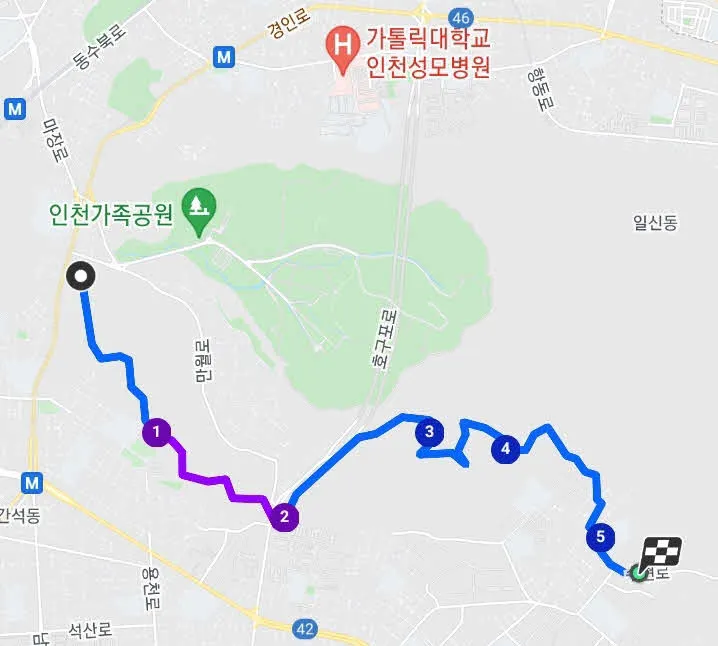 우리는 이쯤에서 인천둘레길 5코스를 마무리하기로 했다. 인천대공원은 매일(?)가서 운동을 하는 곳이기에 궂이 걸어갈 필요를 느끼지 못했다.