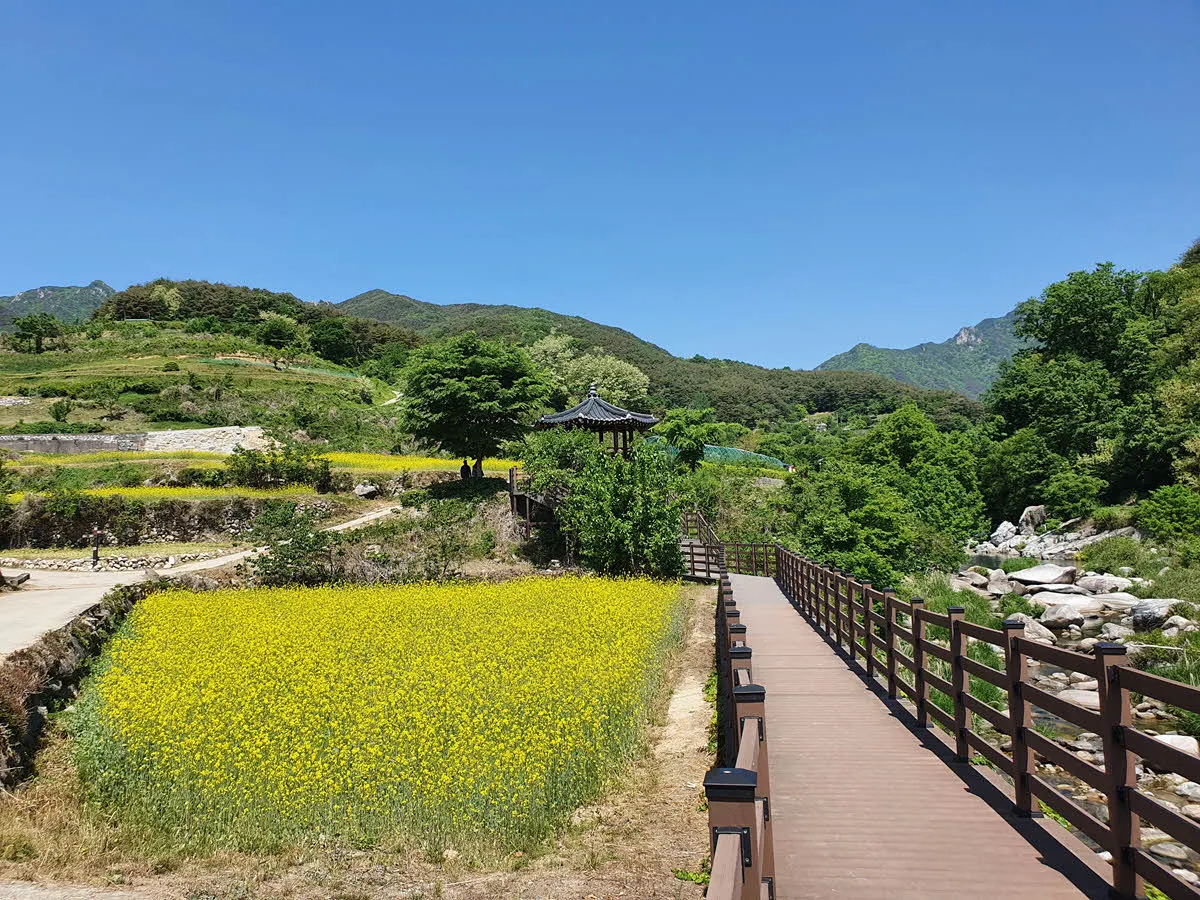 본격적인 소리길 시작 전, 듬성 듬성 마을과 캠핑장이 있는 구간에는 유채꽃이 많이 심어져 있다. 5월 초,중순임에도 유채꽃이 활짝 피어 있다.