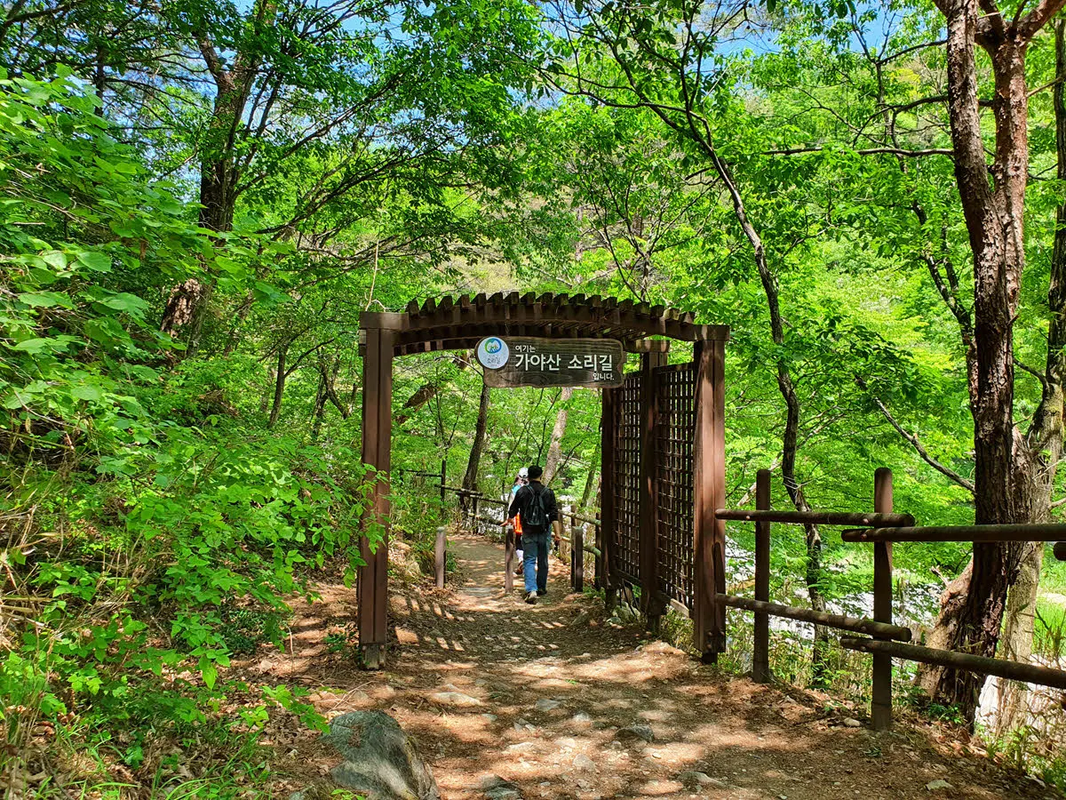 가야산 남쪽의 합천군 가야면에 있는 대장경테마파크 앞 각사교 라는 다리를 건너에서 시작해 가야산 해인사 입구까지 이어지는 가야천을 따라 이어져 있는 6.1 km의 길이 해인사 소리길이다. 마치 오대산의 월정사와 상원사를 이어주는 선재길을 연상케하는 아름다운 트래킹 코스다. 소리길을 걷고자 한다면 대장경테마파크 아래에 있는 주차장에 주차를 하고 각사교를 건너면 소리길 시작점이 보인다.