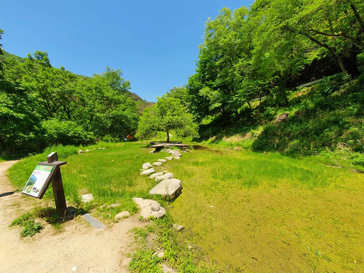 습지 생태계 보존을 위해 조성된 습지. 그리고 습지를 가로지르는 돌다리도 있다.