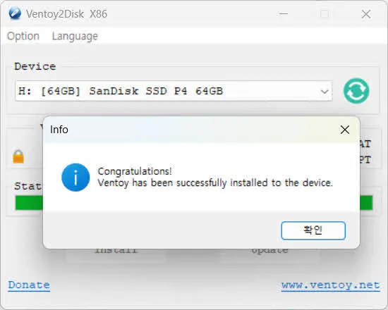 Ventoy 인스톨 작업은 금새 끝난다. 축하한다는 메시지가 나오면 완료된 것이다.