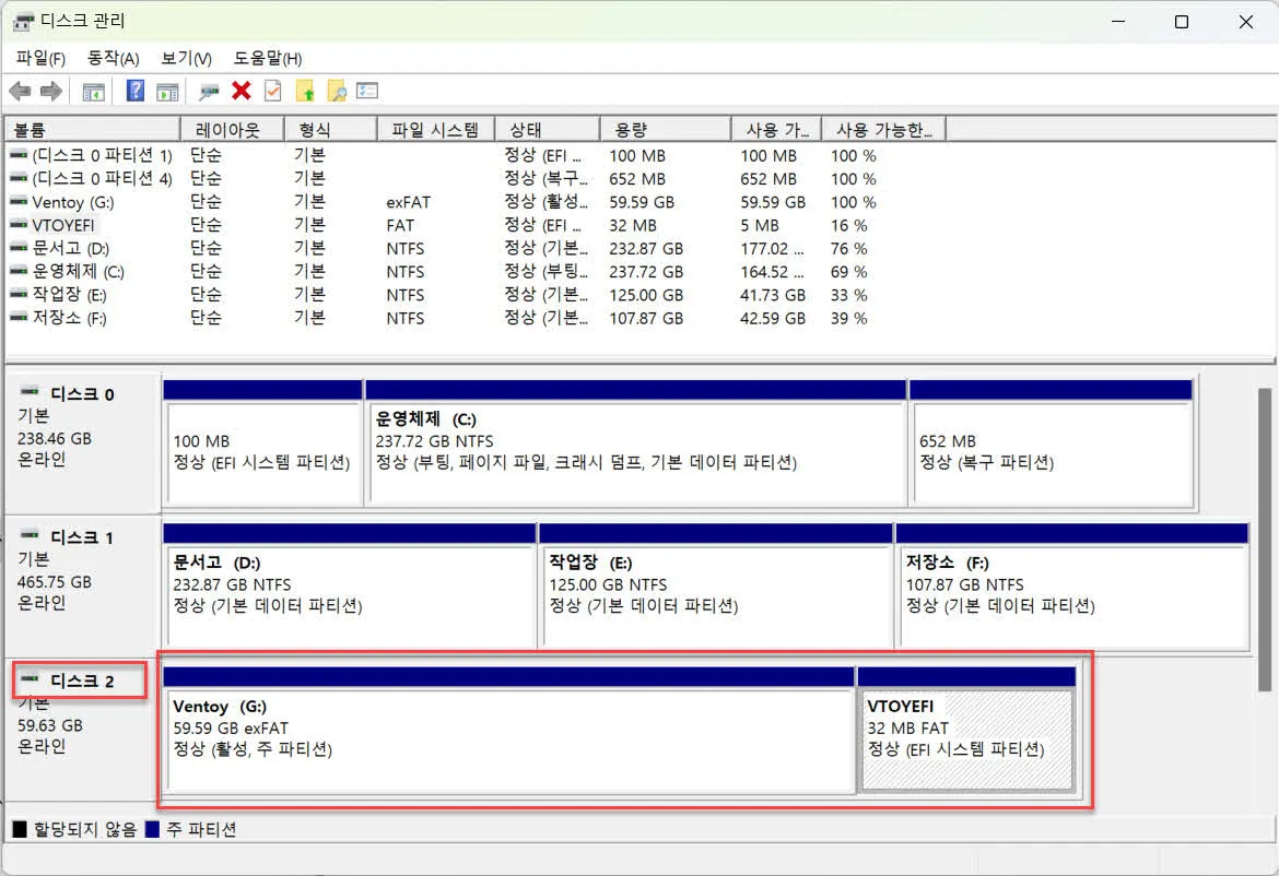 윈도의 디스크 관리자를 실행해 확인해보면 아래와 같이 VTOYEFI 라는 EFI 시스템 파티션 즉 부팅파티션이 생성되어 있고 나머지 공간이 Ventoy 라는 드라이브 이름의 exFAT로 포맷된 파티션이 보인다.