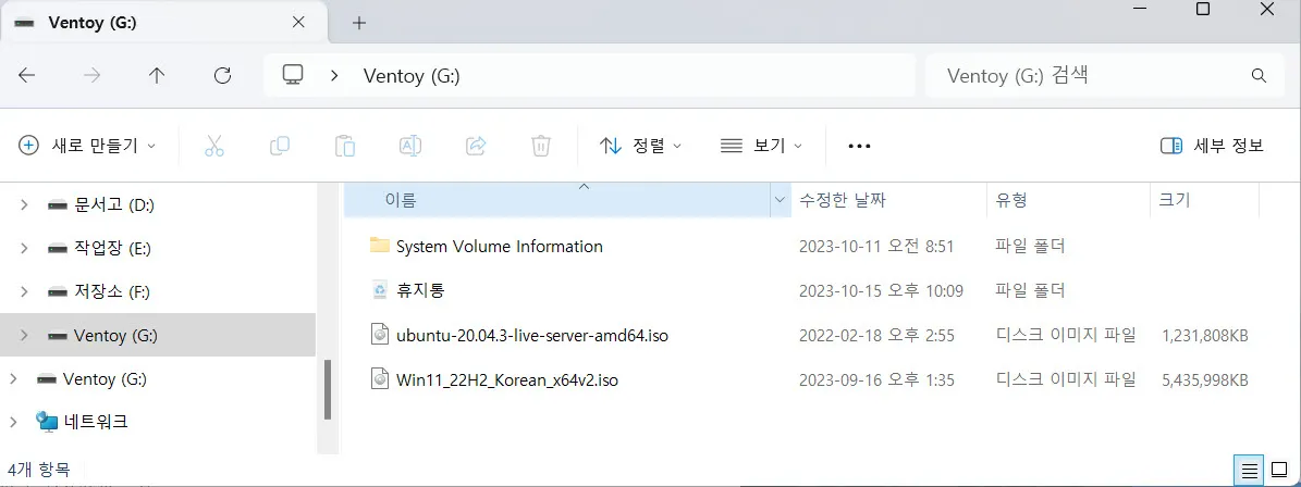 USB 메모리는 G: 드라이브에 꼽혀있고 Ventoy 라는 볼륨이름을 갖고 있다. 그리고 Ubuntu 20.04.3 리눅스와 Windows 11, 22H2 버전의 iso 이미지파일이 들어있는 것을 알 수 있다.